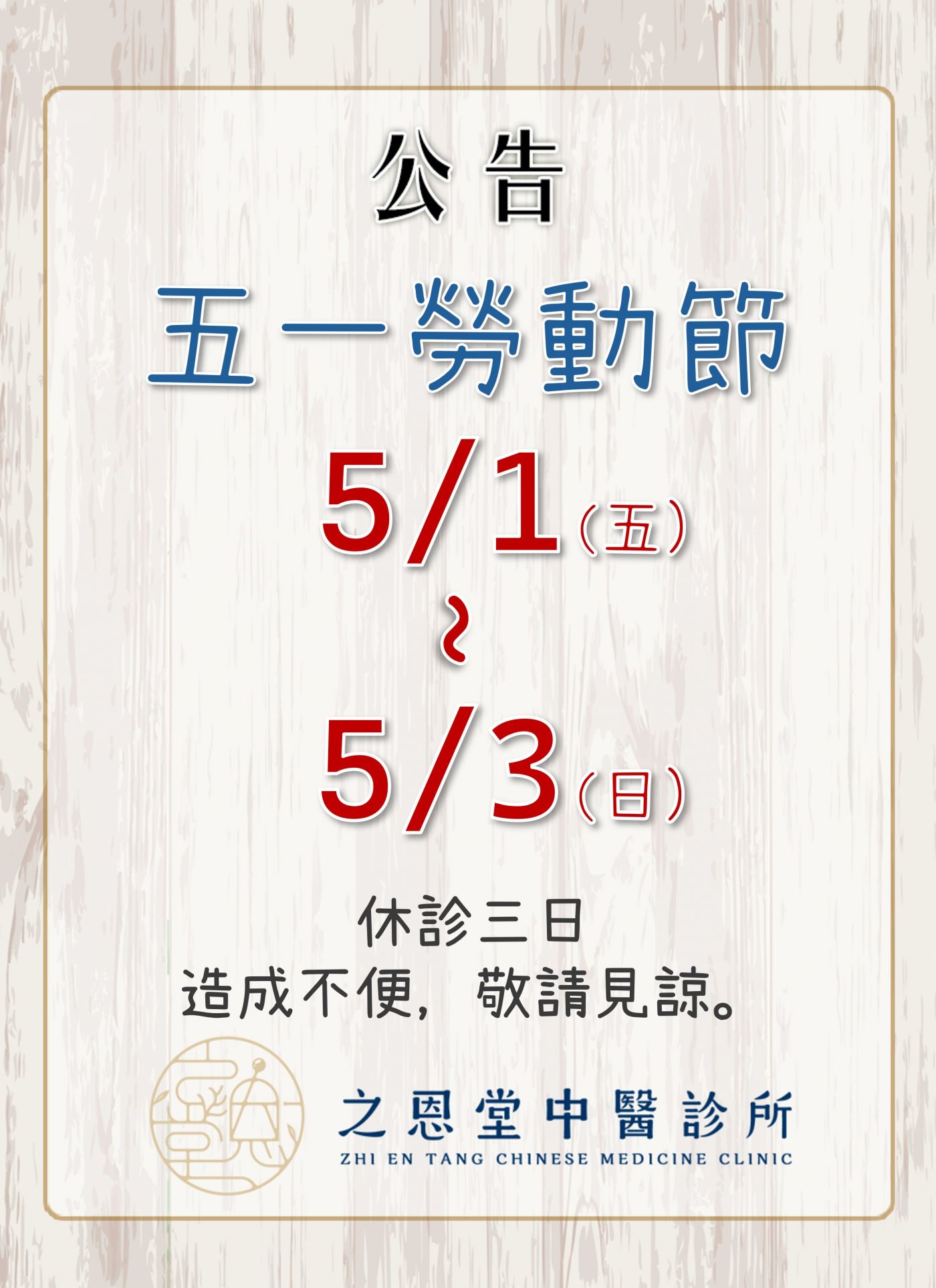 【五一勞動節休診公告】